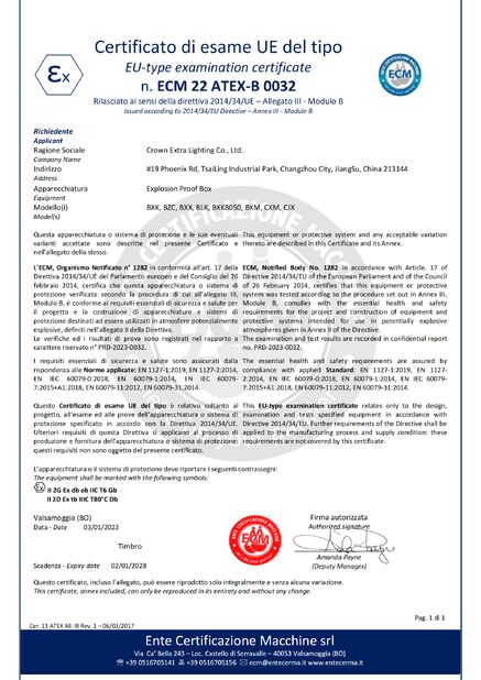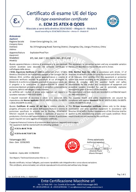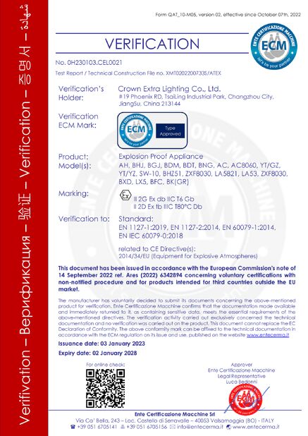 Padrão:ATEX Número:ECM 24 ATEX-D QS01 Data de Emissão:2024-08-06 Data de Expiração:2027-08-05 |